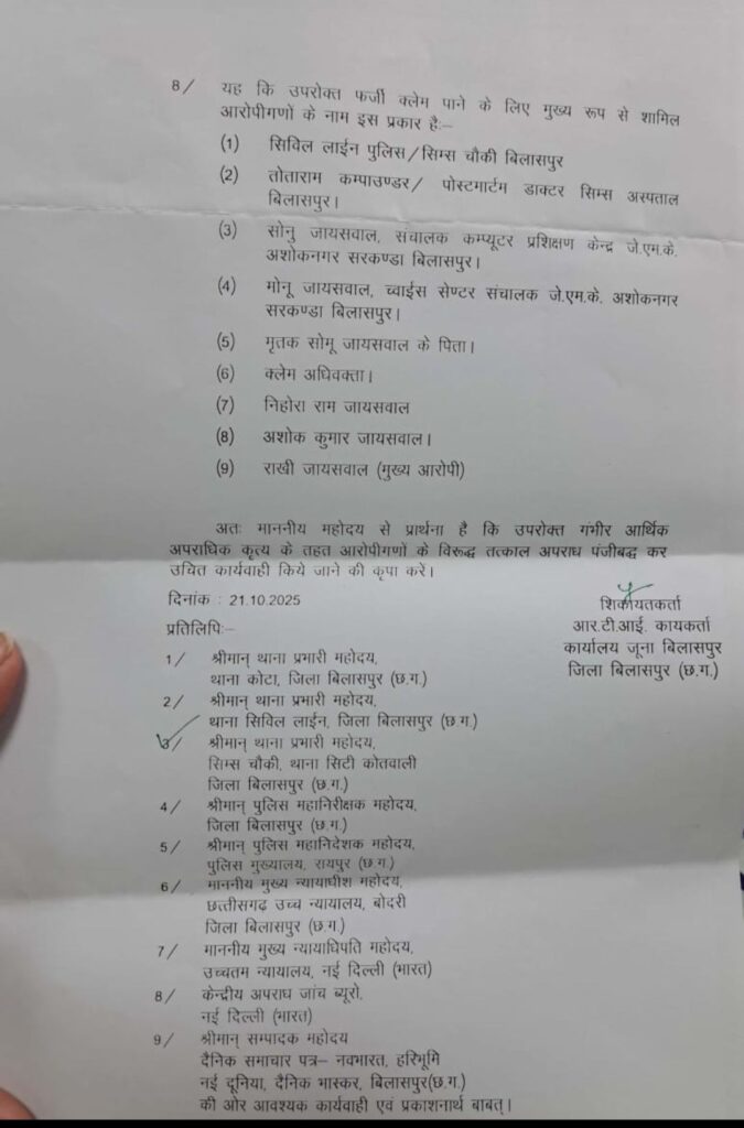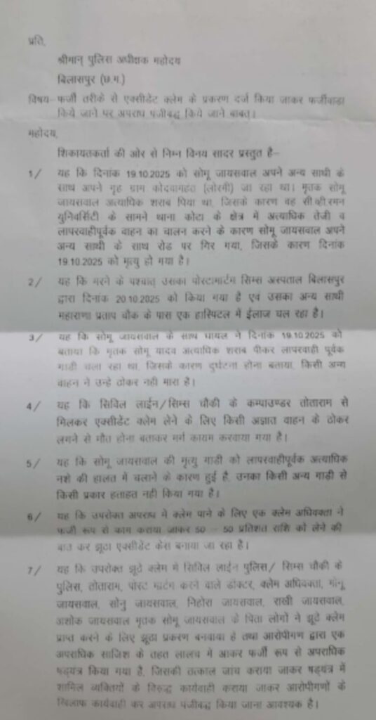 कार्यालय जूना बिलासपुर के आर.टी.आई. कायकर्ता ने कोटा थाना प्रभारी, थाना प्रभारी सिविल लाईन, थाना प्रभारी सिटी कोतवाली, पुलिस महानिरीक्षक, पुलिस महानिदेशक पुलिस मुख्यालय, रायपुर (छ.ग.), छत्तीसगढ़ उच्ब न्यायालय के चीफ जस्टिस, चीफ जस्टिस उच्चतम न्यायालय, नई दिल्ली और केन्द्रीय अपराध जांच ब्यूरो के समक्ष की गई शिकायत में कहा है कि गत 19 अक्टूबर .2025 को सोनू जायसवाल अपने अन्य साथी के साथ अपने गृह ग्राम कोदयाहत (लोरमी) जा रहा था। मृतक सोमू जायसवाल ने अत्याधिक शराब पिया था. जिसके कारण वह कोटा में सी व्ही. रमन युनिवर्सिटी के सामने अपने साथी के साथ रोड पर गिरा और, अस्पताल में उसी दिन उसकी मौत हो गई।वही उसके साथी का महाराणा प्रताप चौक के पास एक निजी हास्पिटल में ईलाज चल रहा । दूसरे दिन 20 अक्टूबर को सिम्स में मृतक के शव का पोस्टमार्टम कराया गया। आरोप है कि घायल ने 19:अक्टूबर को ही पुलिस के समक्ष बताया था ,कि मृतक सोमू के अत्याधिक शराब पीकर गाड़ी चलाने के कारण वे लोग गाड़ी से खुद गिरे किसी अन्य बाहन ने उन्हें ठोकर नहीं मारा है। आरोप है कि ये सारा खेल
