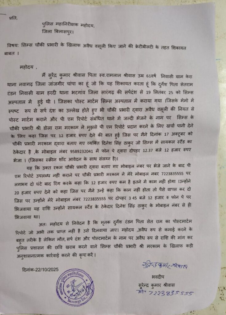 जांजगीर-चांपा जिले के नवागढ़ थाना क्षेत्र के ग्राम केरा निवासी 61 वर्षीय सुरेंद्र कुमार पिता स्व. रामलाल श्रीवास ने आईजी से की गई अपनी शिकायत में सिम्स चौकी प्रभारी के खिलाफ अवैध वसूली का गम्भीर आरोप लगाते हुए बताया कि गत 19 सितंबर 25 को सारंगढ़ जिले के भटगांव थाना क्षेत्र के ग्राम हरदी के दुर्गेश पिता सेतराम टंडन की सिम्स अस्पताल में मौत हुई थी। उसके शव का पोस्ट मार्टम सिम्स अस्पताल में ही कराया गया। जिसके मेमो में स्पष्ट रूप से सर्प दंश का उल्लेख होते हुए भी चौकी प्रभारी दौलाराम द्वारा पोस्ट मार्टम कराने व पी एम रिपोर्ट संबंधित थाने मे जल्द भेजने और पी एम रिपोर्ट देने खर्चा पानी के नाम पर 12 हजार रुपए की मांग की ।