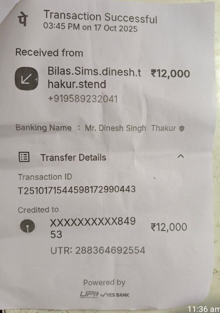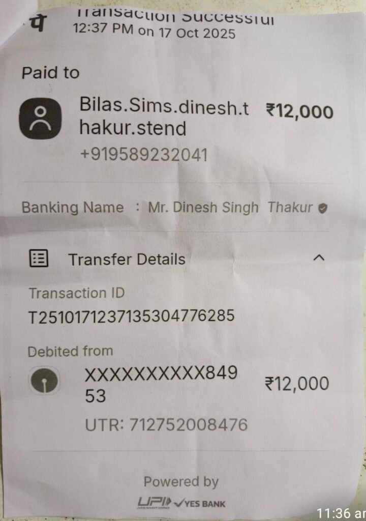सुरेंद्र ने बताया कि उसने गत 17 अक्टूबर 2025 को चौकी प्रभारी के कहने पर सिम्स के सायकल स्टैंड ठेकेदार दिनेश सिंह ठाकुर के मोबाइल नंबर 9589232041 पर फोन पे के जरिये 12 हजार रुपए भेजा।