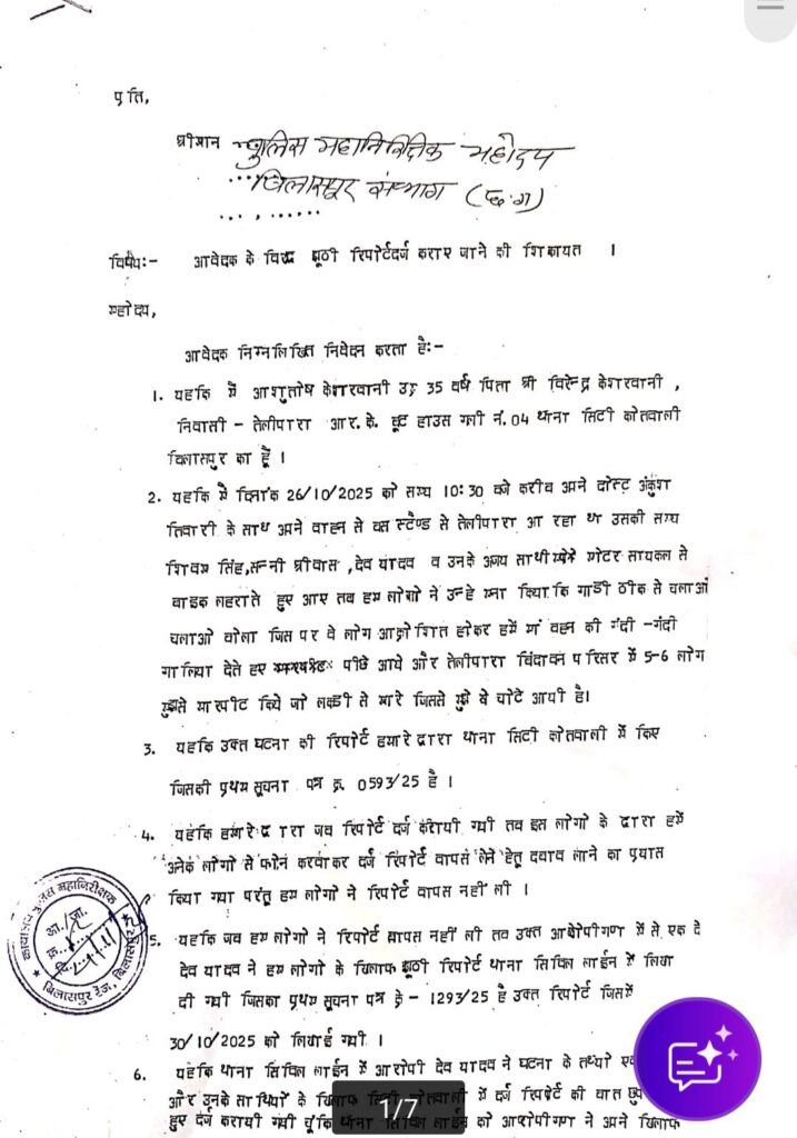 उसका कहना है! कि बिलासपुर में पुलिसिंग का आखिर कौन सा सिस्टम चल रहा है! कि मारखाने के बाद भी उसके खिलाफ झूठी रिपोर्ट दर्ज करा दी गई. और घटना स्थल भी बदल दिया गया…