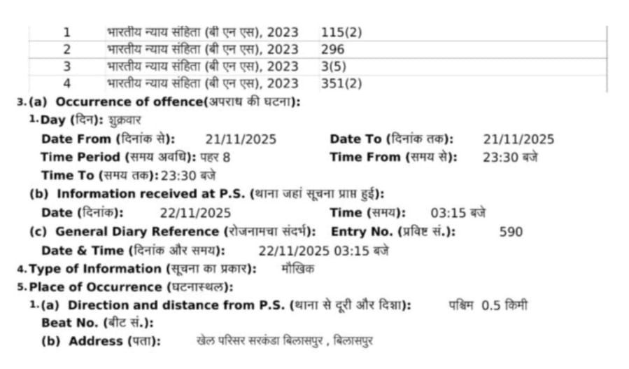 कि गाड़ी से उतरे आयुष दुबे, नवीन गोस्वामी, शिवम मिश्रा और सुशांत सराफ ने गाली गलौच कर लात-घूसों से हमला किया मैदान में मचे दनादन मारपीट के बाद दोनों पक्ष सरकण्डा थाने पहुचे और ने एक-दूसरे के खिलाफ एफआईआर दर्ज कराई ।