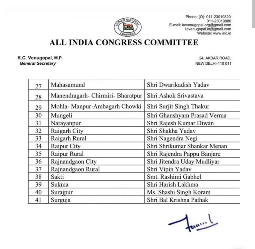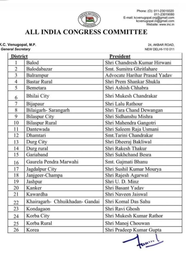 विधानसभा, लोकसभा और निकाय चुनाव मे कांग्रेस को मिली करारी हार के बाद से संगठन में बदलाव की मांग उठ रही थी। लंबे समय से जिला व शहर कांग्रेस कमेटी के नए अध्यक्षो की नियुक्ति का इंतजार था, तरह तरह के कयास लगाए जा रहे थे। शुक्रवार रात एआईसीसी ने छत्तीसगढ़ की बहुप्रतीक्षित 41 जिला और शहर कांग्रेस कमेटियों के अध्यक्षो की सूची जारी कर दी। बिलासपुर जिला व शहर कांग्रेस कमेटी के अध्यक्ष का दायित्व इस बार युवाओं को सौंपा गया है, जिससे युवाओं में उत्साह है।